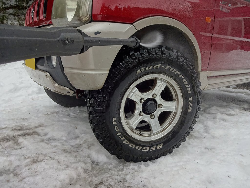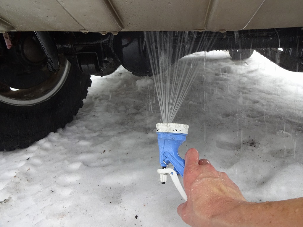 次に高圧洗浄機から、上記画像のような普通のノズルに切り替えて高圧洗浄機では届かなかった部分を徹底的に洗います。画像はイメージが湧きやすいように車高の高いスズキ・ジムニーを使っていますが、普通車だと車高が低いので高圧洗浄機は細かい部分や真上、ホイールの内側等は届かないのでこのような細部を通常ノズルで洗車します。ちなみに当店ではこの作業はノズルと自身の手が入る部分はすべて行います。当然ですが終わる頃には手と腕はキズだらけですし、膝を付いて作業するので服もズボンもビショ濡れとなります。融雪剤が撒かれるのは当然雪の降る冬ですので、非常に寒くて痛い作業です。しかし、ここで「寒くて痛いから。」と言う気持ちで適当に洗浄作業を行ったり、作業自体を行わなかったりする方は趣味車を乗る資格は無いと思います。当店のお客様の中には、「自宅で洗車出来ないから、洗車場で高圧洗浄機で出来るだけ洗車してから、洗車機(ブラシを使わない高圧洗浄だけのタイプ。)を使って下回りを洗う。」と言う手順を必ず行う方もいます。ここまでやると、融雪剤を多く撒かれるエリアでもキレイな下回りを保てるのです。サビは気が付かないうちに手遅れになるレベルまで進行する事も多いので、オーナー様が出来る限り発生する原因を取り除いてあげる事が、愛車にとって最善の対策だと思います。