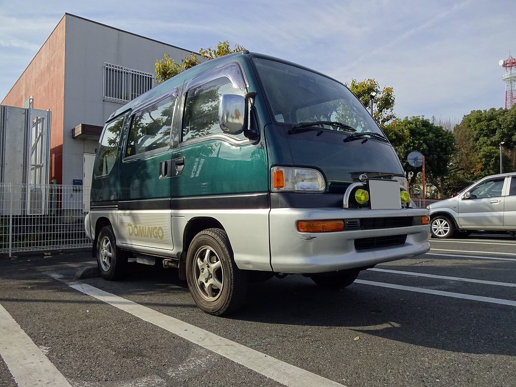 来週頭くらいに公開予定ですが、スバル・ドミンゴGV-Rが入庫します。5MT、4WD、エアコン、パワステ等の快適装備も完備で、走行3万2000kmと言う超低走行車!当然ですが、放置されていた低走行車ではありません。車内も新車のような状態で、ぜひドミンゴが本当にお好きな方に乗って頂きたい1台です!ドミンゴはスバル・サンバーと基本的な構造は一緒ですがエンジンを1200ccに拡大し、乗車人数を7人に増やしたコンパクトミニバンです。パワーのあるエンジンと、1020kgと言う現在の軽自動車のワンボックスと同等の軽い車体で、かなりの走破性能を誇る1台です。コンパクトなボディですが室内には余裕があり、大人7人が乗っても全然窮屈さを感じさせません。「家族が多いから7人乗りの車がいいけど、ムダな広さはいらないし個性的な車が欲しい。」とお考えの方にオススメです!ちなみにドミンゴはホイールベースが1885mmと非常に短くて最小回転半径は4.2mとサンバー並みの数字です。ライバルのダイハツ・アトレー7はホイールベースが2430mmの最小回転半径は4.4mと言う数字です。これはサンバーも同じですが、ドライバーの真下にタイヤを持って来る事によってホイールベースを短くし、ドライバーの足元も広く出来ると言うスバル伝統の造りをしています。実際に違う車に乗ってみるとすぐ解りますが、ホイールベースを長するためにフロントタイヤをボディのギリギリに設置しているワンボックスは足元が非常に窮屈なのです。商用車でサンバーが多く使われている理由の1つに「足元が広くて、長時間乗っていても疲れにくい。」と言うモノがありますが、乗れば納得出来ると思います。ドミンゴは現在ではかなり数が少なく、MTとなると中古車市場には数台しかありません!しかも今回入庫予定のドミンゴは、グリーンと言う希少なボディカラーな上に超低走行の上質車です!お探しの方はぜひご検討下さい。