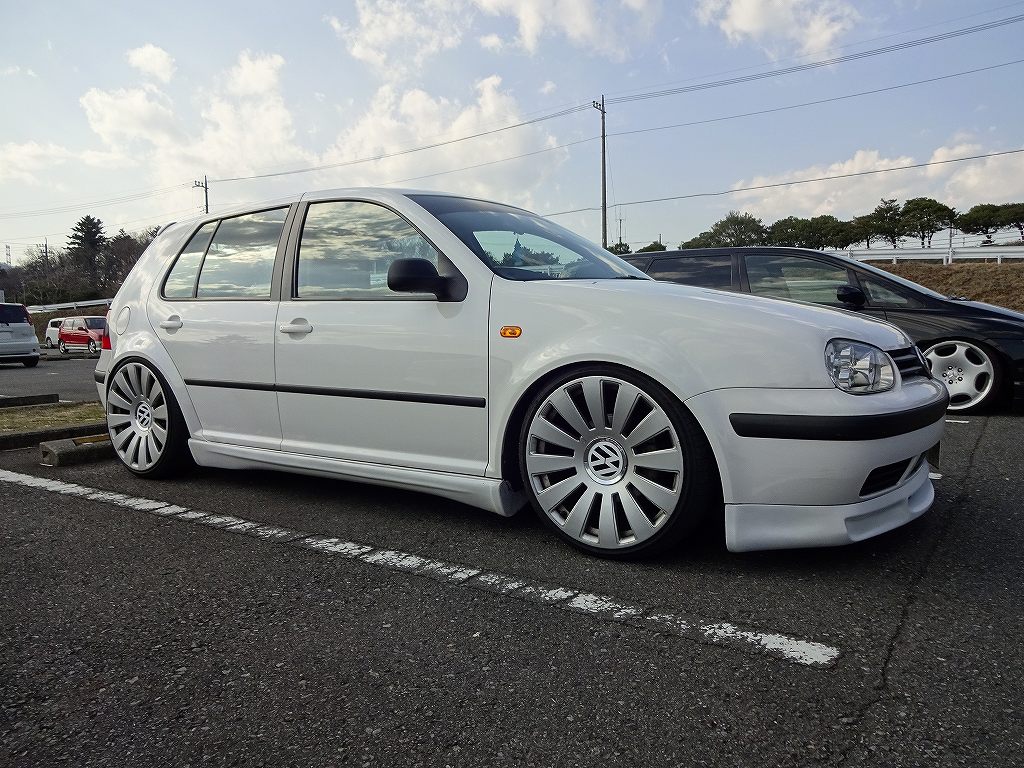 先日のT様のスバル・インプレッサのブログを見た方から、「私も車にも大きいホイールを履かせて欲しいのですが、出来るでしょうか?」と言う質問を何件か頂きました。簡単に言ってしまうと、どんな大きいホイールでも基本的には履かせる事は可能と言って良いと思います。軽自動車に20インチを履かせる事も可能ですし、車高を上げて良いのであれば何インチまででも一応可能だと思います。大切なのは「カスタムした事によって生じる不便さと、自身の希望とのバランス。」です。簡単に説明すると「大きいホイールを履かせて、愛車をカッコ良くしたい!」と言う気持ちが、どこまで不便な状態に勝てるかと言う話です。上記画像は以前にお会いした方の愛車なのですが、フォルクスワーゲン・ゴルフにしてはかなり大きいホイール(確か20インチだったと思います。)を履いていますが、この状態だとかなり色々走行に制限があるそうです。まず、リアフェンダーはタイヤがほぼ常時当たってしまっている状態らしく、フェンダーが摩擦熱によって変色してしまっているレベルです。フロントタイヤもステアリングを切り過ぎると当たってしまいますし、道路のちょっとした段差等でも気が抜けません。そのような走行中は常に色々と気にしなければいけない不便さと引き換えにこのルックスを手に入れたと言う事なのです。ちなみにこちらのゴルフのオーナー様はこのカスタムをすべてご自身でやってしまったと言う、とんでもなく気合いの入った方でした。ここまでの気持ちがないと、このレベルのカスタムカーを乗り続けるのは難しいと思います。「この車でこのサイズのホイールを履かせている人は見た事無いけど、どうしても履かせたい!」と言う気合いの入った方は、まずはお電話でご相談下さい。