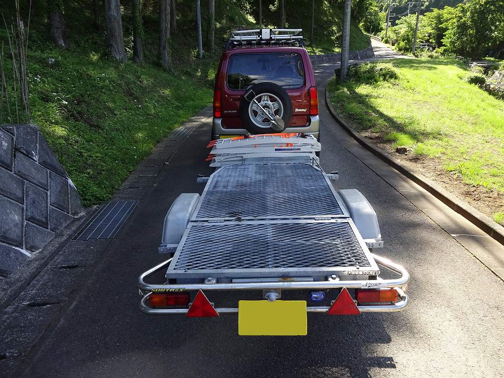 当店のバイク部門で大活躍なトレーラーですが、何も積まないでいる時はちょっと不安になる事があります。牽引車のスズキ・ジムニーもトレーラーも同じ軽自動車で車幅が同じなため、直線を走っているとバックミラーやサイドミラーにトレーラーが全然映らない事があるのです。トレーラーはヒッチメンバーにロックがある上に、太いチェーンで2重に牽引車とつながっているのでほぼ外れる心配は無いのですが、やはりどこにも映らないと一瞬不安になります。ちなみにヒッチメンバーやトレーラー自体が安い海外製等の粗悪品だとかなり危ないです。ヒッチメンバー自体が牽引車から外れてしまったりトレーラーのジョイント部分が壊れたりと、どう軽く見積もっても大事故につながる可能性があるのでこのような重要な部分のパーツは、価格よりも信頼性重視で選んだ方が安心だと思います。トレーラーを使い始めてから半年以上が経過しているおかげで、かなりトレーラーを自由に動かせるようになりました。最初はトレーラーの動きが牽引車と逆に動くのと、静止状態からの力のかけ方がなかなか掴めなかったのですがやっと普通に乗れるようになりました。ちなみにこの半年で、トレーラーに乗ったのは20回程度だったと思います。何も知らなくてもここまで乗れるようになるので、「トレーラーは欲しいけど運転が難しそう・・・」とお悩みの方はご安心下さい。もちろん購入希望の方には私がきちんと乗り方をレクチャーしますので、興味がある方はぜひ1度実車に乗ってみて頂けたらと思います。