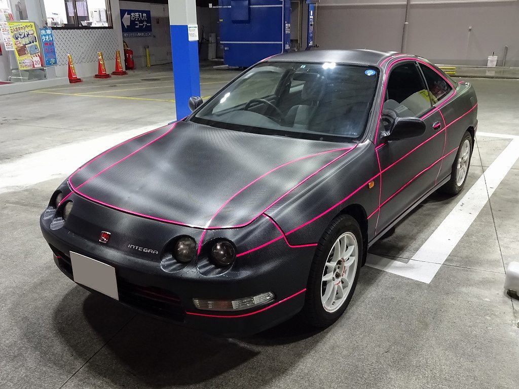 先日ご紹介したホンダ・インテグラのフルカーボン仕様の販売が開始されましたので、興味のある方はこちらから詳しくご覧下さい。販売開始早々、たくさんのお問い合わせと現車確認の予約を頂いておりますので検討されたい方は早めの予約をオススメします。ちなみに今週末の予約状況は、土曜日の夕方と日曜日の夕方以外はすべて予約が入っておりますのでご了承下さい。完成してから何回かテスト走行で乗りましたが、こちらの車両はメチャクチャ目立ちます!コンビニやガソリンスタンドでも、必ずと言っていい程に「カッコイイですね!これってオールペイントですか?」等と声をかけられるので、目立ちたく無い方には不向きだと思います。こちらの車のグレードはZXですがボディが軽いので走りも楽しく、乗っても眺めても大満足な1台に仕上がっています!また、ピンクの蛍光ラインテープは昼間も目立ちますが、夜になるとさらに妖しく発光するので、上記画像のようにガソリンスタンド等の多少の明かりがある駐車場だととても目立ちます。ちなみに画像ですと、ボンネット等が波打っているように見えますが、これは表面が立体的に造られているのでこのように映るだけです。実際に触って頂くと、表面がきちんと立体的になっているのが解ります。このような仕様の在庫車は滅多にありませんので、画像を見て「欲しい!」と思った方は売れてしまう前に現車だけでも見た方が良いと思います。これからボーナスシーズンに突入するので本店、下溝店共に在庫が動く事が予想されます。気になる在庫がある方は、買うとか買わないとかの前に現車だけでも確認する事をオススメします。ちなみに「今すぐにでも詳細を知りたい!」と言う気合いの入ったお客様は、042-780-8263までお電話下さい。本気でお考えの方でしたら当店は24時間対応いたしますので、夜中だろうと明方だろうとお電話頂ければと思います。