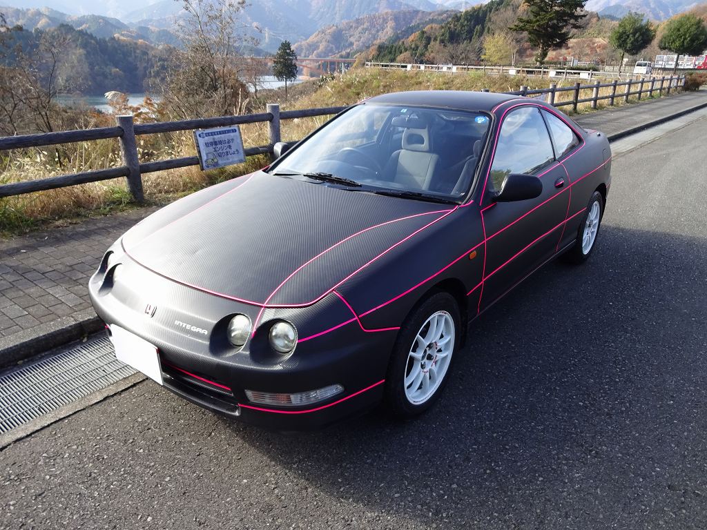 連日、たくさんのお問い合わせを頂いている在庫車のホンダ・インテグラですが、こちらは乗るのに結構勇気が必要かもしれません。今までは夜に機関維持走行をする事が多かったのですが、先日初めて昼間にドライブをしてみました。休憩でパーキングに寄ったのですが、平日で人が少ないにも拘らず結構な人数から声をかけられました。私は車好きで、始めての方と話をする事を楽しむ人間なので良いのですが、あまり初対面の方と話をする事が好きでなない方には結構大変かもしれません。昼間は太陽光によってカーボン目がさらに強く見えるので、夜とは違ったカッコ良さがあります。ちなみに「ボディの手入れはどうするんですか?」と言う質問が多数ありましたが、基本的には普通の洗車だけで大丈夫です。泥や鳥の糞等の、カーボン目の間に入り込むような汚れは歯ブラシ等で優しく擦ってあげれば大丈夫です。カーボンシートを貼っていない普通のボディでもそうですが、鳥の糞は塗装の表面を劣化させるので発見したらすぐに取り除く事が重要です。カーボンシートも普通の塗装も、思っているよりも早いペースで劣化させられますので、出先等で発見した場合でもペットボトル等で水を汲んで来て、全部が落ちるまで洗ってあげた方が良いでしょう。また、現在では希望はありませんが蛍光ピンクのラインはすべて簡単に剝がせます。もしオールブラックのカーボンのみの仕様がご希望の方は、納車時にすべて剝がしてから納車する事も可能ですのでご相談下さい。