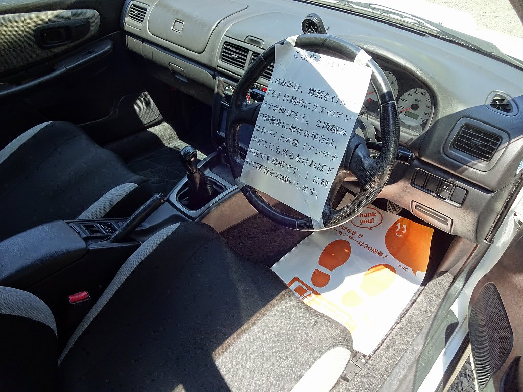 今ではどこのお店もそうですが、全国納車が可能になっております。大体の場合(当店はスケジュールと距離が合えばスタッフが自走する場合もあります。)が陸送会社に陸送を依頼してお客様宅へ納車してもらうのですが、当店ではここで毎回ある事を実施しております。それは「陸送してもらう車の特徴や、予想出来るトラブルの可能性を説明した注意書きをステアリングに貼っておく。」と言う事です。当然ですが陸送会社はきちんと保険に加入しておりますので、もし何か事故があったりして車にキズが付いたり壊れたりしたらきちんと保険で修理してくれます。しかし、保険は右から左へ「はいそうですか。」とは行きませんし古い車はパーツの入手も時間がかかるので、確実に数週間から数ヶ月の時間は必要になって来ます。せっかく苦労して手に入れた新しい愛車がいきなりトラブルに見舞われた上に、その修理や処理に数ヶ月もかかったら最悪な気分になりますので、「直してもらえる、もらえないの話ではなく、トラブル自体が起こらないのがベスト。」なのです。そのため、当店は上記画像のように陸送してもらう車1台1台に、その車をキャリアカーで運ぶ時の注意事項をステアリングに貼っています。実はこの「ステアリングに貼る。」と言うのも結構重要な事なのですが、陸送会社はほぼ必ずと言って良い程複数回色々な箇所を経由して陸送します。例えば「神奈川県から新潟県に届けるために神奈川県から埼玉県に行って、埼玉県から福島県まで行く便に乗せ替える。福島県に到着したら新潟県まで行く便に乗せる。」と言った具合に、何回かキャリアカーを乗せ替えます。この乗せ替えは深夜や早朝等の判断力の鈍る時間にも行われるため、ドライバーの1番目の付く場所に大きく注意書きを貼るのです。お店によっては「陸送会社に直接電話して、注意事項として伝えれば良い。」と考えているみたいですが、陸送会社への電話1本で何千人といるドライバーのスケジュールから該当する車に乗るドライバーを特定し、直接注意してくれる事なんてほぼありません。もし注意してくれたとしても、ドライバーも人間ですので前述の判断力の鈍る時間に乗せ替え作業をしたら忘れている可能性は大です。このような理由から当店では上記画像のような張り紙をしています。陸送中の事故は陸送会社の責任ですが、陸送会社へすべての責任を投げるのでは無く、当店は当店の出来る限りの事故を未然に防ぐ対処を行います。ちなみに当店は陸送してもらう会社やメンバーまで厳選する場合があります。内容は企業秘密ですが、上記対処のさらに一歩先を行く対応だと思っております。「陸送なんてどこでも一緒。」と思っているととんでもないトラブルに遭ったりするので、充分ご注意下さい。