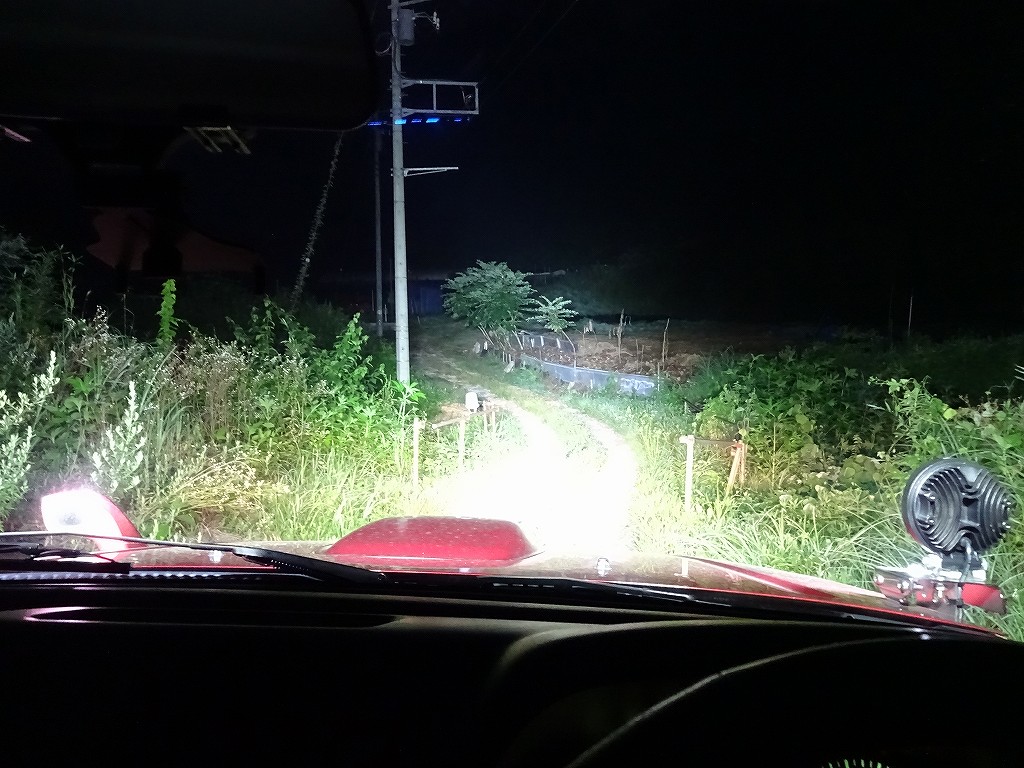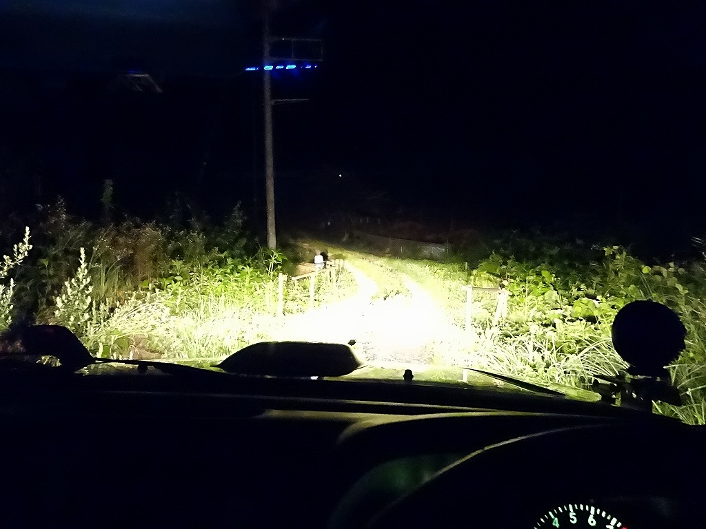 こちらがボンネットの追加ライトを追加で点灯した状態です。色合いがイエローからホワイトになったのが解ると思います。ボンネットから照らしているせいか、さらに遠くまで見えるようになっています。
