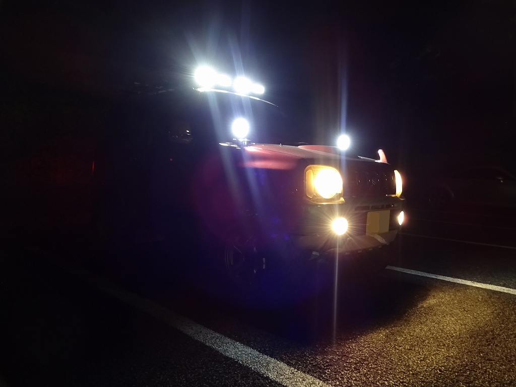 こちらがルーフキャリアも含めた、すべてのライトを点灯した状態です。縦、横共にレベルの違う広範囲を照らしているのが解ると思います。まぁまずここまでライトが必要になるシチュエーションは無いのでしょうが、見た目が好みなので良しとします。
