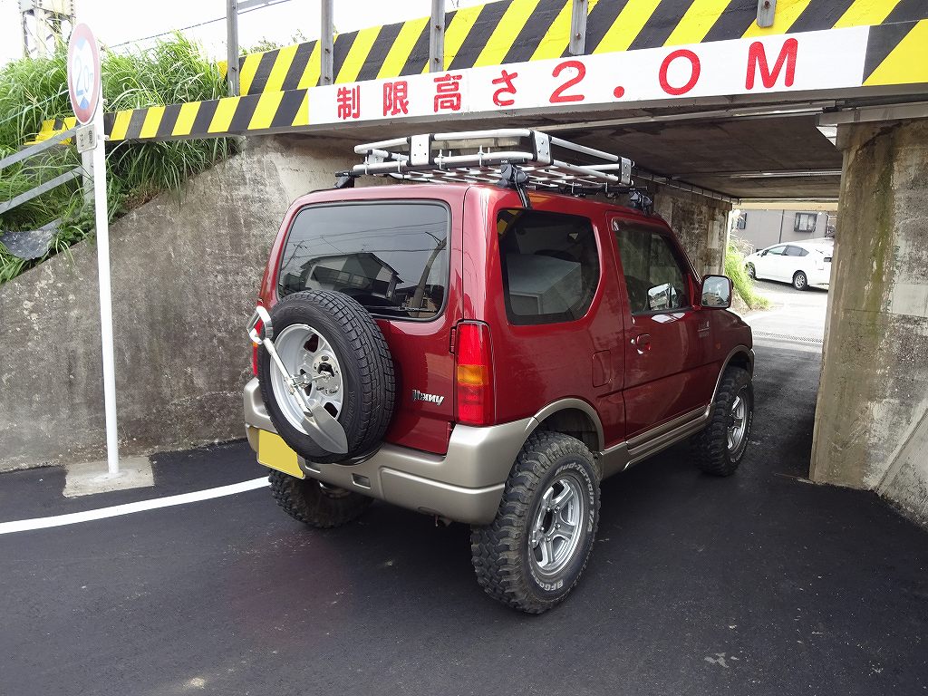 冬の生命保険&セカンドカーとして活躍中のスズキ・ジムニーですが、調子に乗ってカスタムし過ぎたので全高がかなり高くなってしまいました。私のようにメインがスポーツタイプの車だと、全高よりも車高の方を気にするクセがついてしまっているので、車高の高い車に乗ると車高制限のあるゲートや駐車場は結構キケンです。もちろんカスタムによって車高は変わって来るので一概には何とも言えませんが、危ないと感じる場所は窓から頭を出して上を見ながらゆっくり入って行くと、愛車をぶつけたりせずに済むと思います。参考までのデータですが、私のジムニーは2インチリフトアップでタイヤがグッドリッチのLT235/75R15、純正ルーフレール無しの固体に後付けでルーフキャリアを装備していますが、1900mmまでのガードは接触せずに入れました。ちなみに以前私の友達で、軽トラックのルーフ部分に後付けキャリアを搭載していた友達がいますが、ノーマルでもギリギリだったトンネルにいつも通りの感覚で入って行って見事にキャリアを粉砕した人がいます。比較的固定方法が緩いタイプのキャリアだったので、キャリアが吹っ飛んで中身をバラ撒く程度の被害で済みましたが、これがしっかり固定されるタイプのキャリアだったらルーフが歪んだり、ヘタすりゃガラスも危なかったかもしれません。もちろん速度が出ている状態でキャリアがぶつかって、ルーフやピラーが歪んだりして修理したら「修復暦有りの車両。」となってしまう可能性が大きいです。全高の高い車に乗る時は下だけではなく、上にも気を配ってあげると安全だと思います。